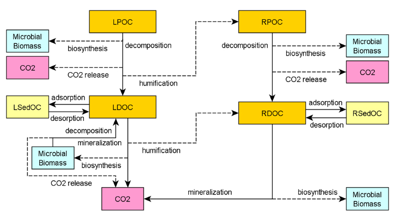 RPOM는 미생물의 분해 작용으로 인해 각각의 분해속도에 따라 LDOM와 RDOM로 변환되며, 이 중 일부는 미생물의 섭취로 인해 미생물 생체량 증식에
