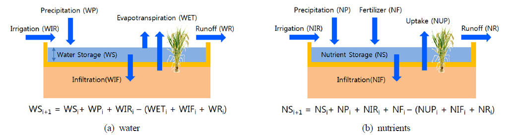 유역모델은 논에서의 수문과정을 고려하지 못하는 한계를 갖는다. 이를 개선하기 위해 논에서의 수문과정을 고려한 국내 연구로는 Kim et al. (2003), Jeon et al. (2007) 등의 연구가 있다. 이 중 Jeon et ad. (2007)은 HSPF에 기반하여 논에서의 담수능력과 시비에 의한 영양물질 농도변화를 모의하기 위한 HSPF-Paddy 모델을 개발하였으며, Kim et al. (2014)은 보청천 유역에 대해 HSPF-Paddy의 적용성을 평가하였다. 논에 대한 STREAM에서의 유량 및 영양물질 수지를 모식도로 나타내면 Fig. 7과 같다.