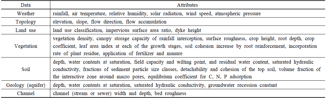 자료 구축의 가능성을 고려하여 STREAM 구동을 위해 요구되는 시공간 자료를 정의하고 이를 모델 개발에 반영하였다(Table 1). 시계열 자료로는 강수량, 기온, 이슬점 온도, 일사량, 풍속 및 대기압 등의 기상자료와 모델 보정과 검정을 위한 유량, 수질 등의 관측자료가