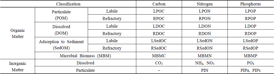 것으로 가정하였으며, 질소 변환은 C/N 비율에 따라 탄소 변환의 일부분으로서 발생하는 것으로 설계하였다. 입자상 유기물의 형태로 존재하는 LPOM와