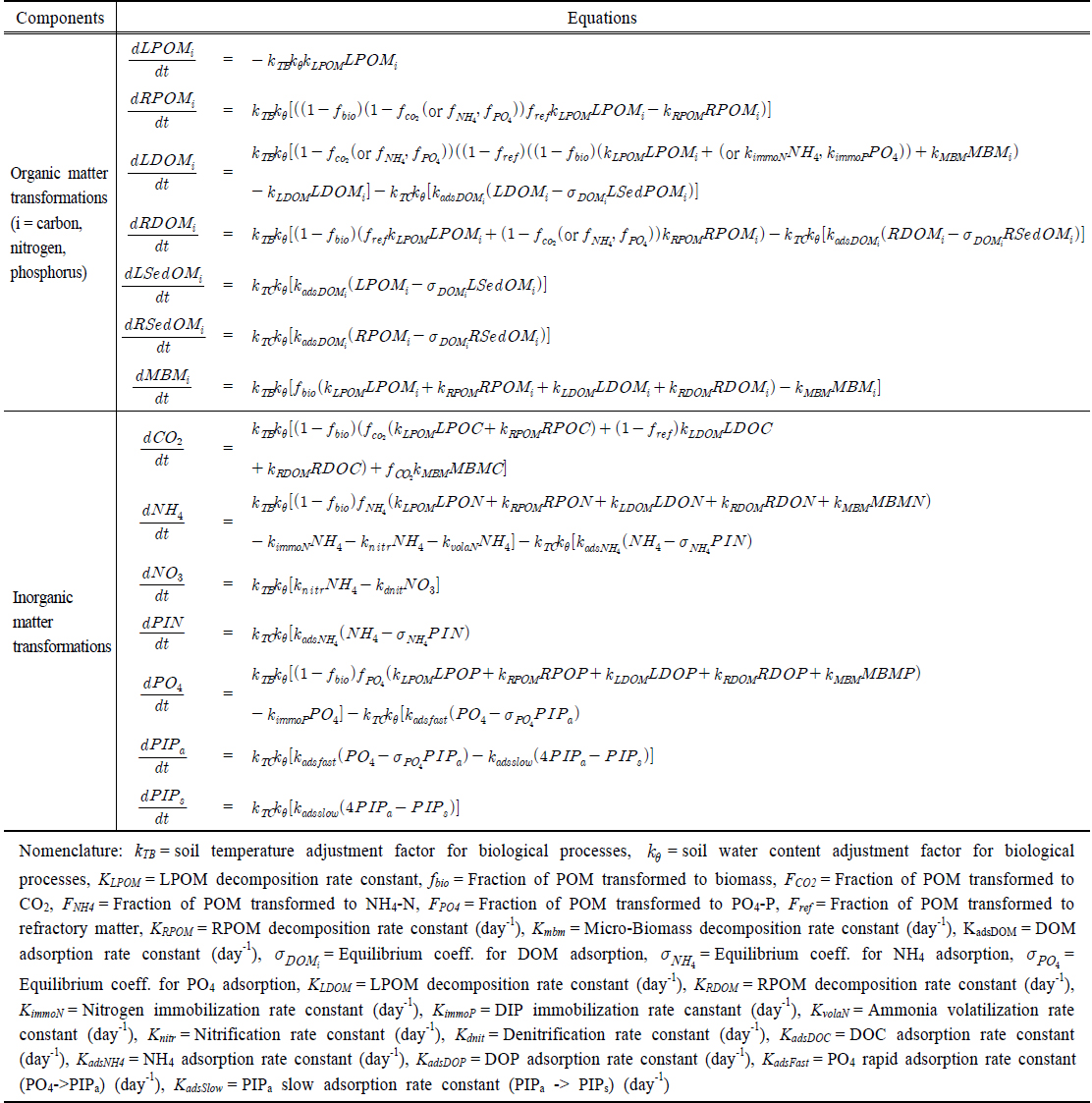 생성된다. 유기물의 분해과정에서 미생물의 생합성에 이용되는 유기물의 비율은 생합성 비율(fbio)이며, 유기물이 분해될 때 생합성에 이용되지 않고 남은 유기물의 일부는 난분해성 물질로 변환되는데 그 비율은 fref로 정의된다. 미생물에 의해 생합성이 되지 않거나 난분해성 물질로 변환되지 않은 유기물의 일부는 fCO2, fNH4, fPO4의 비율로 CO2, NH4, PO4로 변환되며 나머지는 미생물에 의해 에너지원으로 이용된다. 토양과 수체 내 탄소, 질소, 인 유기물의 변환과정은 기본적으로 동일한 형태를 나타내는