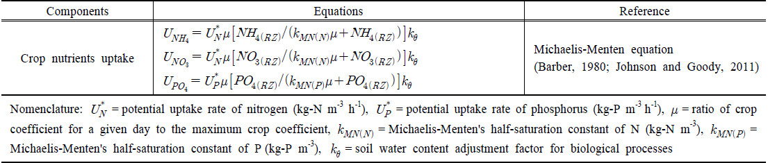 아래로 내려갈수록 지수적으로 감소하는 것으로 가정하였다. 식물 뿌리에 의한 무기물의 흡수량 산정에 사용되는 매개변수 중 , , kMN(N), kMN(P)와 함께 일별 식물성장비율(μ)를 함께 적용함으로써 계절에 따른 식물생장 및 무기물 요구량의 변동을 고려하였다. 또한 토양수분조정계수(kθ)를 적용함으로써 토양 함수량에 의해서도 무기물의 식물 흡수량이 제한된다. 토양함수량이 field capacity 이상이면 무기물의 흡수에 제한이