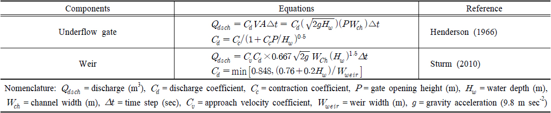 우리나라에서 가장 흔하게 사용되는 직사각형 보(rectangular weir)를 가정하며, 유량 산정은 유량계수 Cd와 접근속도계수 Cv를 이용하여 산정한다(Sturn, 2010). STREAM에서 배수문과 보로부터 유량을 산정하는 방정식은 Table 8의 식과 같다.