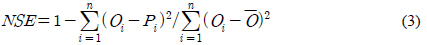 지수로 1.0에 가까울수록 모의값이 실측값의 경향을 잘 반영하는 것을 나타낸다. 이 중, 효율지수 NSE 산정은 식 (3)과 같다(Nash and Sutcliffe, 1970).