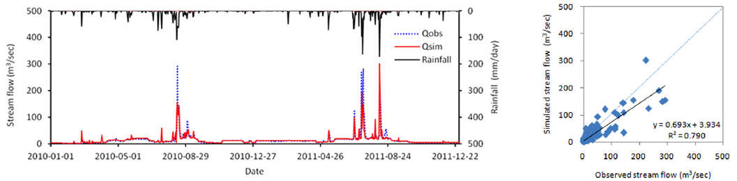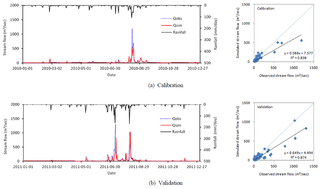 검정 20%의 오차를 보여주었다. 또한 보·검정에 사용되지 않은 유역 내부의 고산 유량 관측소를 대상으로 검정을 수행한 결과 R2 0.78, NSE 0.77의 결과를 보여주었다. 총유량의 경우 2010~2011년 모의기간 동안 3%의 양호한 총오차를 보였으며, 최대유량에 대해서는 2010년 47%,