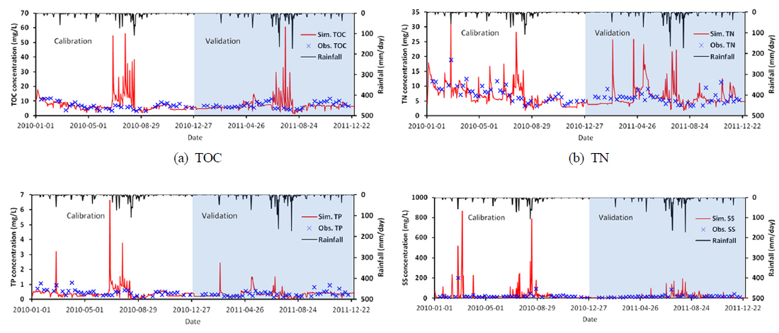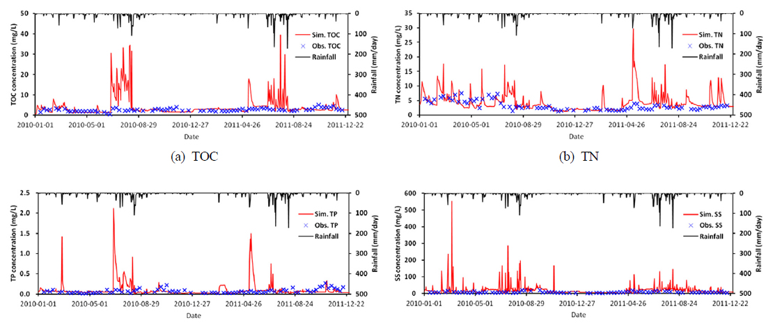 함을 시사한다. 2010~2011년 검정시기의 최소농도 오차를 살펴보면, TOC 150.3% (관측 0.500 mg/L, 모의 1.252 mg/L),