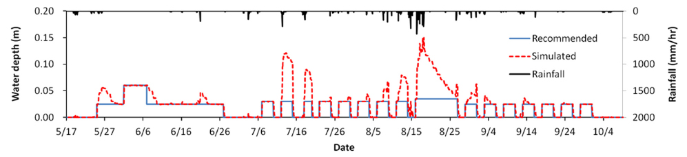 Simulated water depth and recommended ponding depth for growth stages of rice in the
