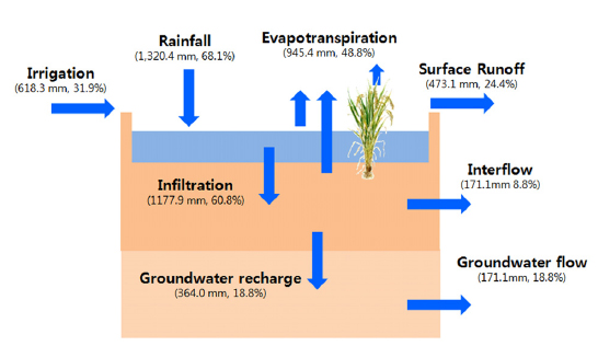 것으로 분석되었으며, 토양 침투량은 총유입량의 60.8%인 1177.9 mm/yr인 것으로 분석되었다. 논을 통해 수계로 유입하는 유량은 지표수유출