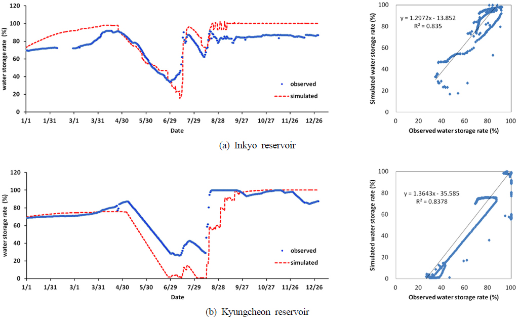 이용하여 저수지 모듈의 모의결과를 검증하였다. Fig. 10의 (a)는 인교 저수지의 저수율 변화를 보여준다. 인교 저수지는 저수용량이 1.2×106 m3인 중규모 저수지로 여름철 관개시기에 저수량이 감소하는 경향을 모델이 적절히 구현하고 있음을 알 수 있다. Fig. 10의 (b)는 경천저수지의 저수율 변화 모습을 보여준다. 경천 저수지는 저수용량 2.5×107 m3인 대규모 저수지로 여름철 관개시기에 저수량이 감소하는 경향을 모델이 반영하고 있으나, 모의결과는 저수용량이 모두 소진될 때까지 관개가 발생하여 관측값과