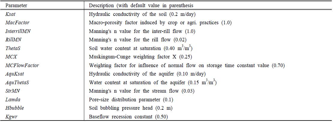 방법의 하도추적 가중인자 MCungeX, 모의시간간격 선정을 위한 하천만수 시 유속 가중인자 MCFlowFactor, 하천의 조도계수 StrMN 등을 선정하여 민감도 분석을 수행하였다. 지하수 유출과 관련해서는 대수층의 포화수리전도도 AquKsat, 대수층의 공극 AquThetaS, 지하수 유출 감수계수 Kgwr 등을 선정하였다. 유사침식과 이동과 관련된 매개변수는 침식과 이동이 발생하는 공간 범위에 따라 면상(sheet), 릴, 하천의 매개변수로 구분할