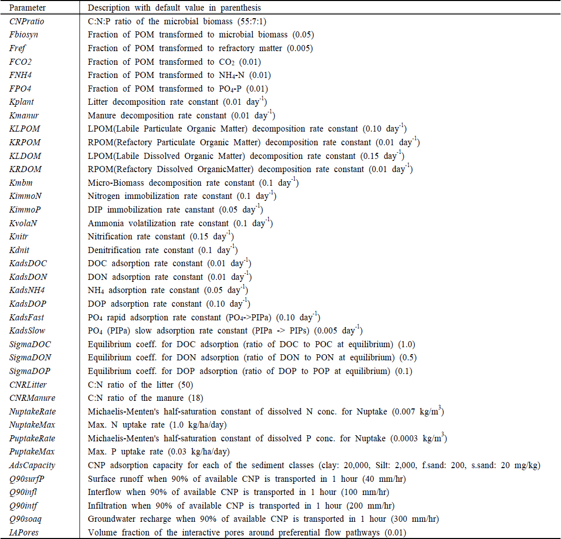수 있다. 먼저 면상침식 및 이동과 관련된 매개변수로 단위 강우에너지에 의한 유사분리량 Det, 습윤 토양에서의 점착성 증가 Cho, 지표수의 유사운반능력에 대한 단위 수류력(unit stream power) 임계치 omegaCr, Everaert (1991)이 제안한 지표수에 의한 유사이동 경험공식의 KIntrA, KIntrB 등을 선정하였다. 릴과 하천에서의 유사침식과 이동에 대해서는 릴의 토양 점착성 CohRill, 식생에 의한 토양 점착성 증가 cohByRoot, Van Rijn (1984)이 제시한 부유사, 소류사 이동과 관련된 참조 높이에서의 부유사 농도 ConstSS와 소류사 농도 ConstBL, Shields diagram의 무차원 전단응력 TStarC 등을 선정하였다. 영양물질 변환 및 이동과 관련해서는 미생물 생체량의 CNP 비율을 나타내는 CNPratio, 유기물 생분해 과정에서 항목별 변화율을 나타내는 Fbiosyn, Fref, FCO2, FNH4, FPO4, 유기물의 분해속도상수를 나타내는 Kplant, Kmanur, KLPOM, KRPOM, KLDOM, KRDOM, Kmbm을 선정하였다. 질소 변환과 관련하여 KimmoN, KvolaN, Knitr, Kdnit 등의 속도상수, 인의 변환과 관련해서는 부동화 속도상수 KimmoP을 선정하였다. CNP의 유사 흡착과 관련해서는 KadsDOC, KadsDON, KadsNH4, KadsDOP, KadsFast, KadsSlow, SigmaDOC, SigmaDON, SigmaDOP를 선정하였다. 낙엽과 퇴비의 CN 비율을 나타내는 CNRLitter, CNRManure, 식생의 양분섭취와 관련된 NuptakeRate, NuptakeMax, PuptakeRate, PuptakeMax, 유사의 CNP 흡착능력을 나타내는 AdsCapacity, 물의 이동에 따른 CNP 이동 능력을 나타내는 Q90surfP, Q90infl, Q90intf, Q90soaq, IAPores 등의 매개변수를 선정하였다.