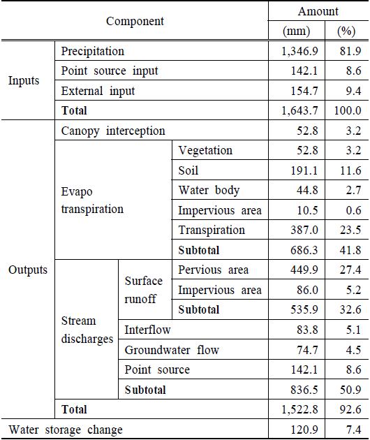 mm로 증발산 구성 요소 중 가장 높은 비율을 차지하는 것으로 분석되었다. 유역에서 수계로 유입되는 유출성분은 지표 유출, 중간류 유출, 지하수 유출,