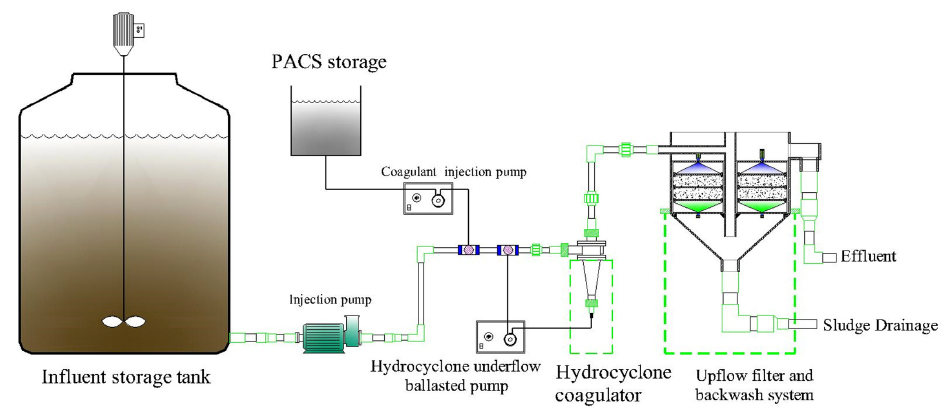 일정 유량을 hydrocyclone으로 유입시켰다. 응집제는 폴리염화규산알루미늄(polyaluminium chloride silicate, PACS)계열