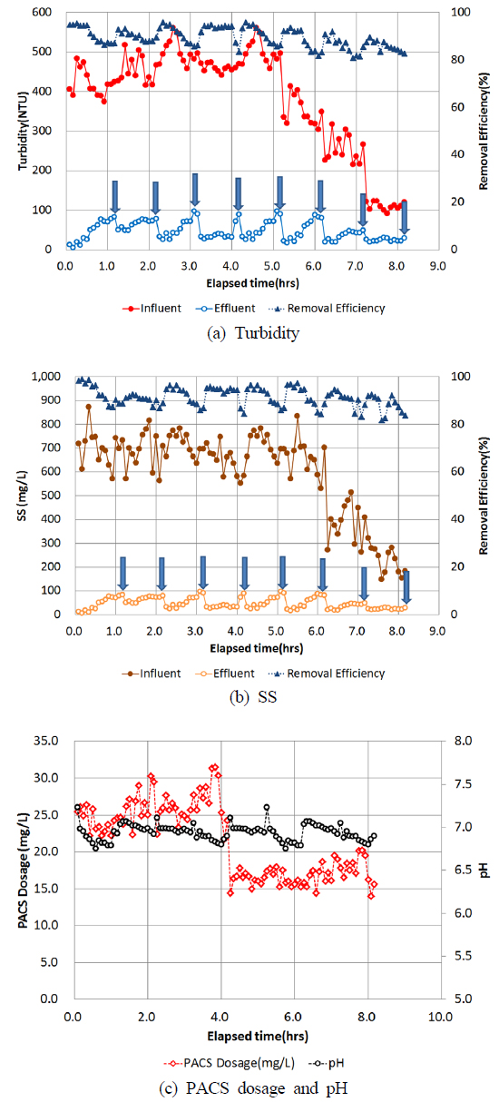 m3/day (평균 10.1 m3/day), 여과지 수면적 부하율을 기준한 SOR은 45.5~65.9 m3/m2/day (평균 55.7 m3/m2/day), PACS 주입농도는 14.0~31.5 mg/L로 운전하였다. 탁도 제거효율은 81.0~95.8% (평균 89.5%), SS 제거효율은