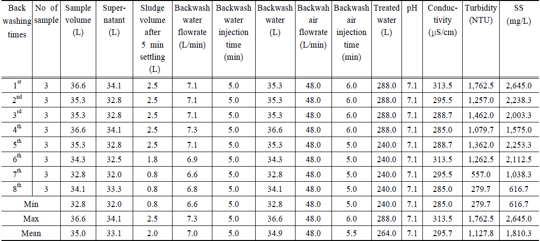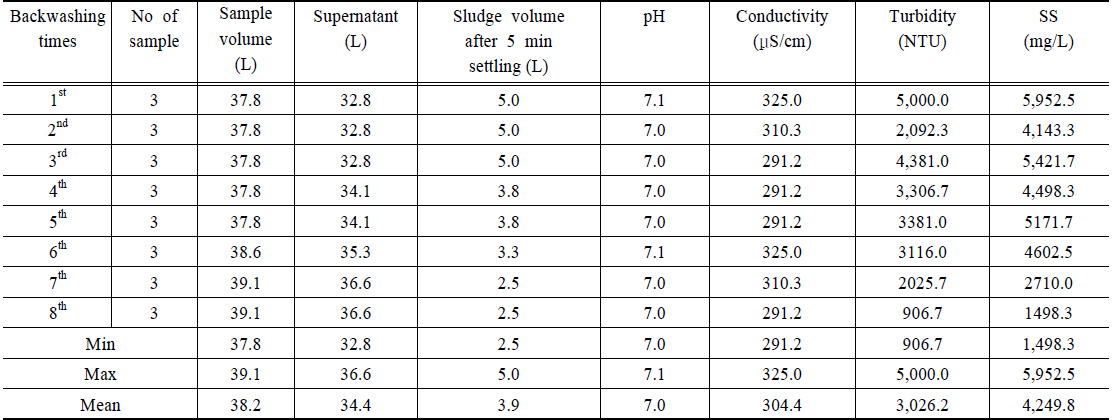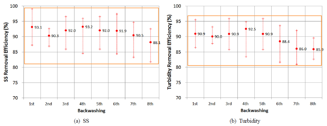 분석되었다. 역세척 횟수별로 탁도와 SS 제거효율을 분석한 결과 탁도 89.5%, SS 91.4%로 역세척 효과를 나타내었다.