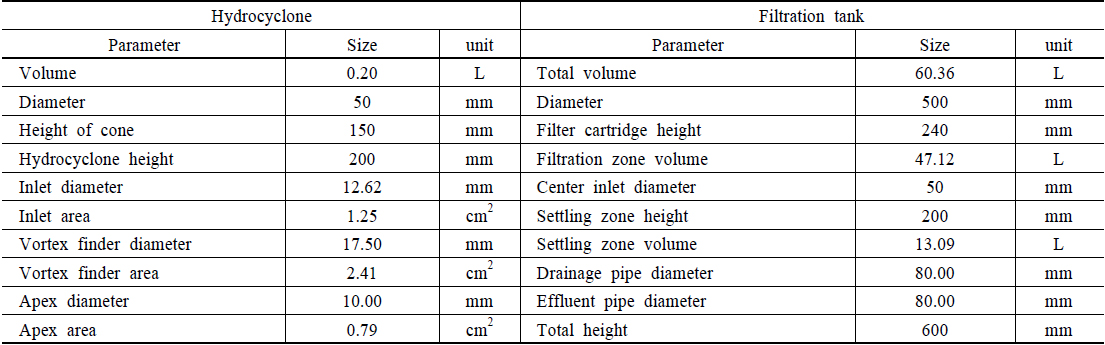 구성하였다. Hydrocyclone과 여과조의 설계 제원은 Table 1과 같다. Hydrocyclone의 내경은 50 mm, 전체 높이는 200 mm이고 하단 콘 높이는 150 mm, 상단 높이는 50 mm이며 전체