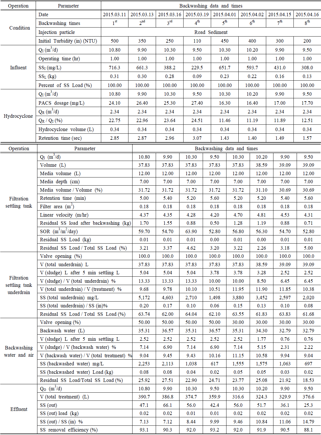 4월 16일까지 8일 동안에 하루 1 hr씩 운전하여 총 8.19 hr을 연속 운전하였으며 8회 역세척을 실시하였다. 도로 퇴적물을 수돗물에 희석하여