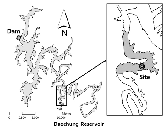 조사 지점은 대청호 추소리에 위치하고 있으며 소옥천과 대청호의 경계 지점에서 대청호 방향으로 약 800 m 떨어진 지점(36°21'32.4"N, 127°34'02.1"E)이다(Fig. 1). 이 지점의 비강우시 유속은 평균 0.05 m/s로 하천보다는 호소의 특성을 나타낸다(Oh and Cho, 2015). 또한 조사 지점에서는 매년 심각한 수준의 조류대발생이 관찰되기 때문에 금강물환경연구소에서 조류경보제의 관찰지점으로 선정하여 주기적인 모니터링을