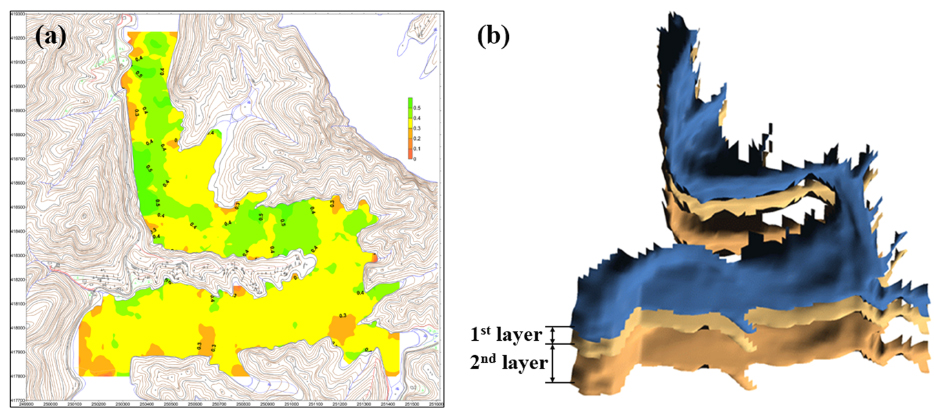Distribution of sediment at the Chusori area (a) and three dimensional model of sediment