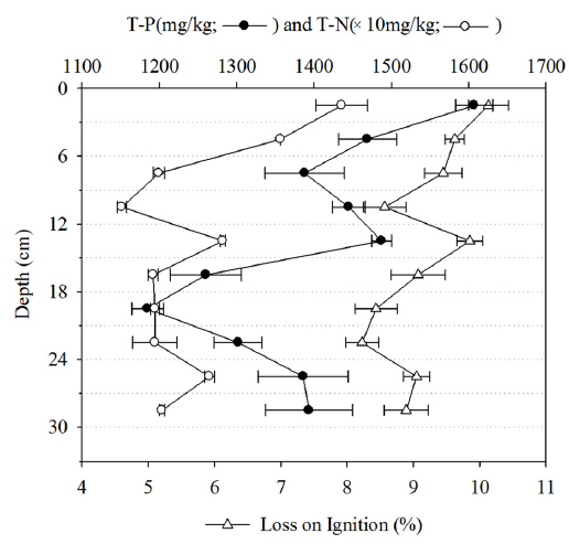 완전연소 가능량(강열감량)에 대하여 “명백하거나 심각하게 오염된 상태”로 판단되는 13%를 넘지 않았다(Table 1). 하지만 총질소의 농도는 8,182(±655) mg/kg으로 모든 시료에서 하천 호소 퇴적물 오염평가 기준인 5,600 mg/kg을 초과한 것으로