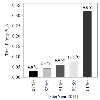 3월 30일부터 6월 13일까지 5회에 걸쳐 대상 지점의 바닥 층에서 50 cm의 수심에서 수시료를 채취하여 총인의 농도를 분석한 결과, 수온이 15℃
