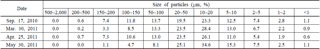 비율을 차지하였으며, 특히 실트 중 10~20 μm 크기의 입자가 23.3% (2010년 9월 17일) ~ 34.6% (2011년 5월 30일)의