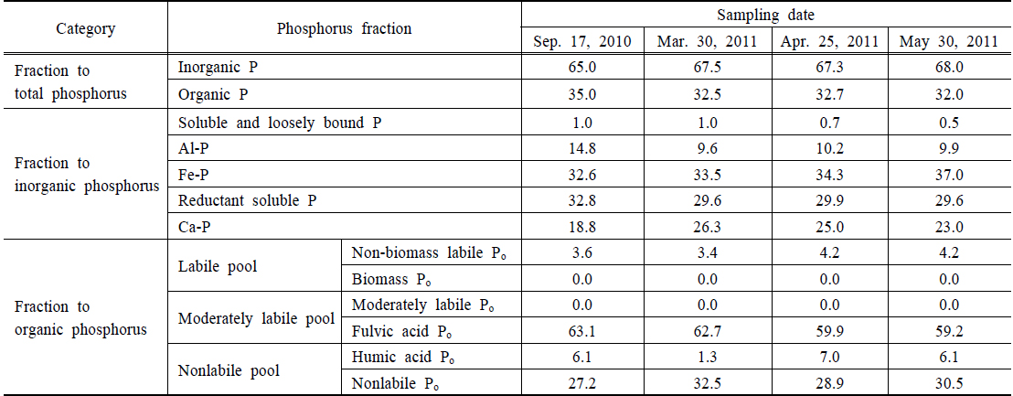 속하는 인의 함량은 전체 유기인 중 평균 3.9(±0.4)%로 낮았다. 하지만 moderately labile pool에 속하는 fulvic acid-Po의 함량이 59.9~63.1%로 nonlabile pool 유기인에 비해 매우 높은 비율을 차지하였다(Table 3). 이러한 결과로부터 대상 지점에는 환경 변화에 따른 pH의 변화 또는 미생물의 활성도 증가에 따라 비교적 쉽게 용출 가능한 인의 비율이 높았으며,