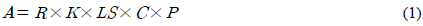 본 연구에서는 표토침식량 산정을 위하여 USLE 모델을 사용하였으며, 이 모델은 근 30년간 토양유실량을 산정하기 위해 다양한 연구에서 사용되고 있다(Bagarello et al., 2012; John et al., 2011; Park et al., 2011; Shengpan et al., 2013; Zhenlan et al., 2012). 이 모델은 미국에서 Wischemeier and Smith (1965)에 의해 개발되었으며, 이후 다양한 연구자들을 통해 모델 개선이 이루어지고 있다(Jung et al., 2004; Park et al., 2011; Parveen and Kumar, 2012). USLE 모델은 표토침식량 (A) (ton/ha/yr) 산정을 위하여 강우인자 (R) (MJ·mm/ha·year·hr), 토양침식인자 (K) (ton·hr/MJ·mm),