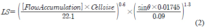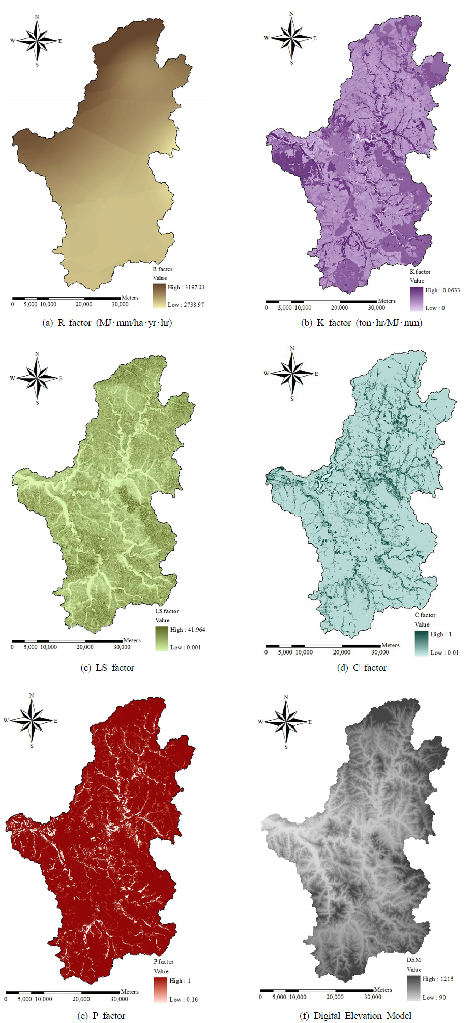 경사도와 경사장인자 (LS) (무차원), 작물피복인자 (C) (무차원), 작물경작인자(P) (무차원)의 5가지 USLE 인자가 필요하다(식 (1)).