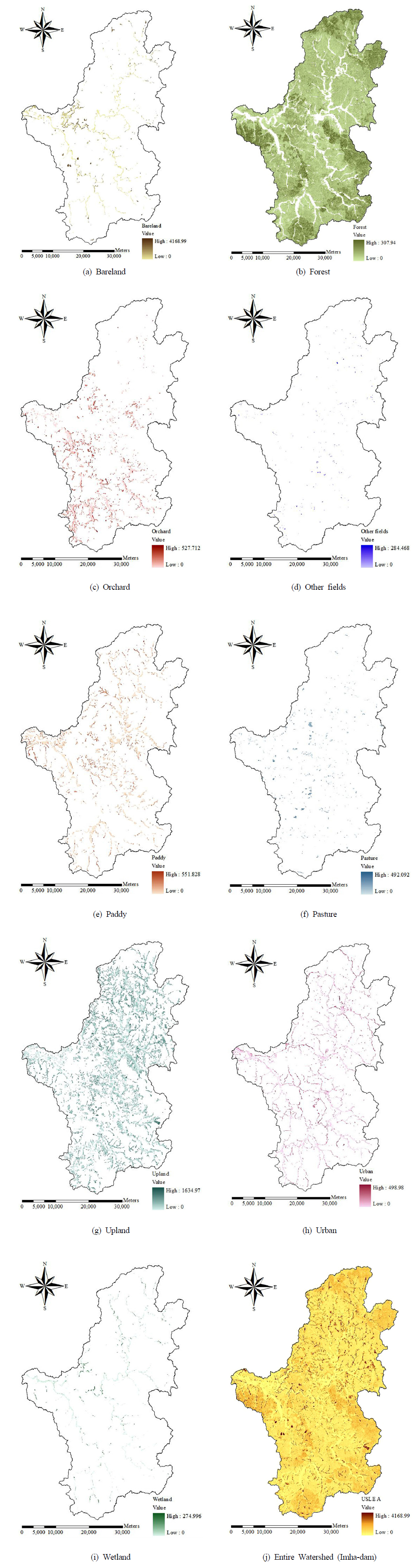 본 연구에서는 위와 같이 5가지의 USLE인자에 대한 입력자료를 구축한 후 GIS를 사용하여 셀 단위 표토침식량을 산정하였다. 그리고 토지이용에 따른