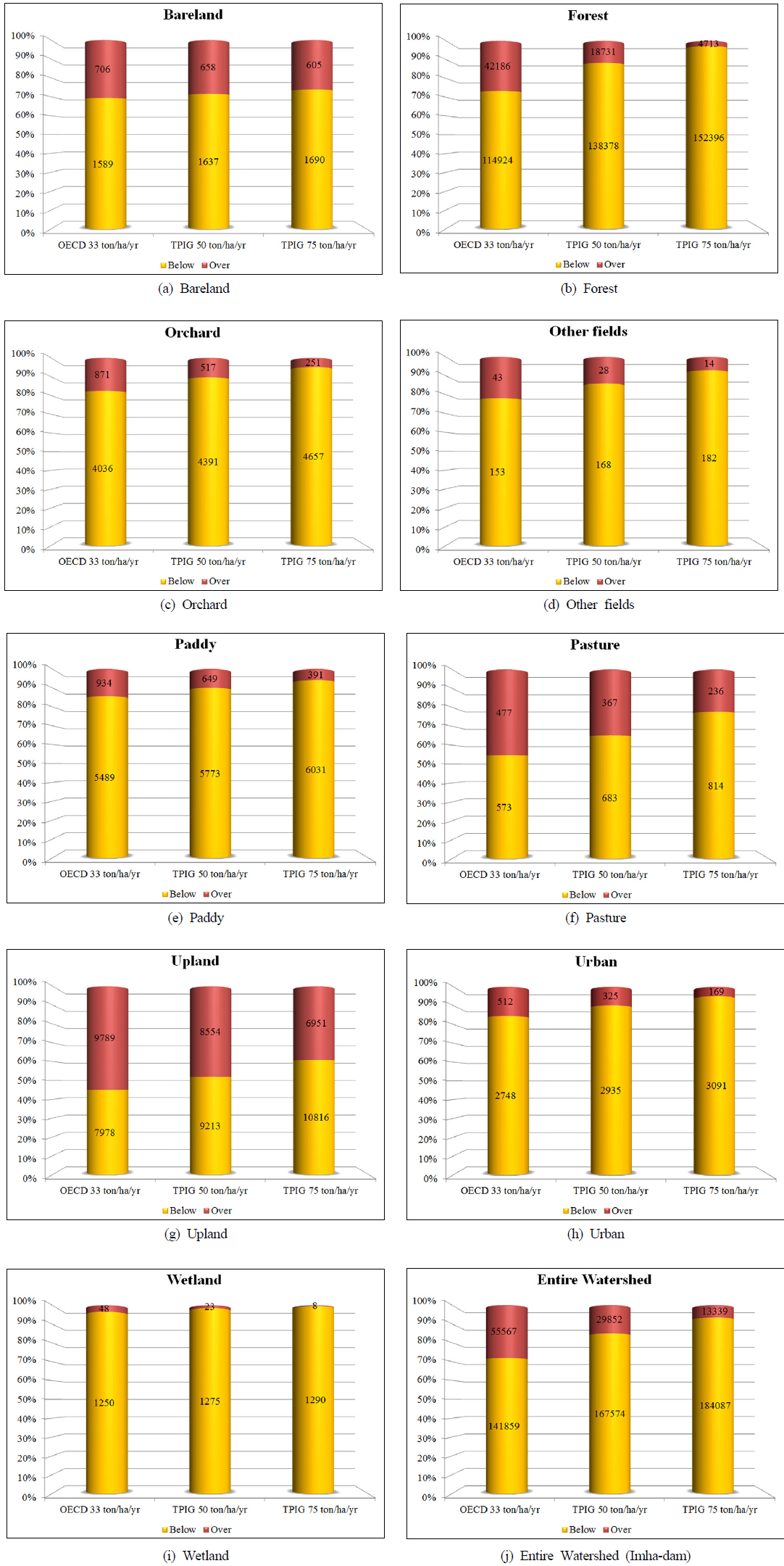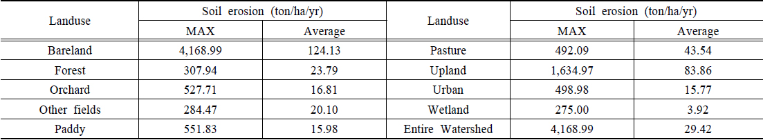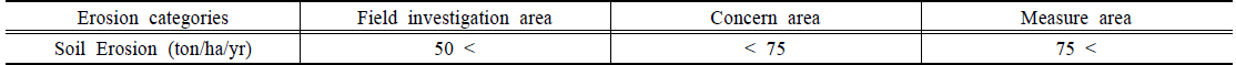 지역에 대하여 현장조사가 필요하고, 75 ton/ha/yr 초과하는 표토침식량 발생시 표토침식 대책이 필요한 지역으로 표토침식지표를 제시하고 있다(Table 5). 그리고 75 ton/ha/yr 미만의 표토침식량이 발생할 때는 표토침식 우려지역으로 표토침식지표를 제시하고 있다. 따라서 본 연구에서는 토지이용별
