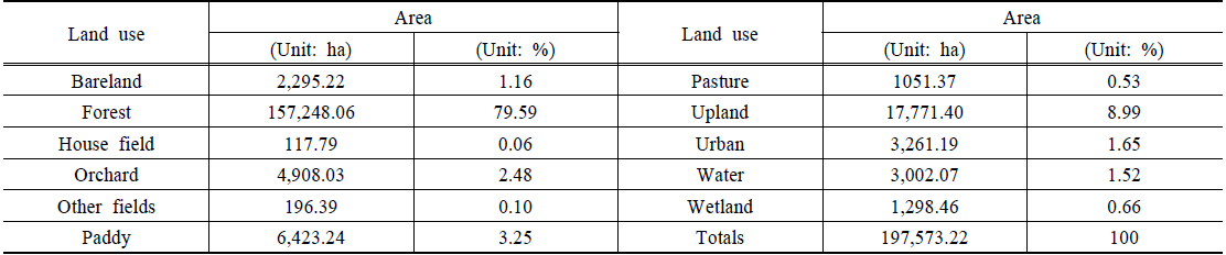 표토침식량 차이를 평가하기 위하여 과수원, 기타재배지, 나지, 도시, 논, 밭, 산림, 습지, 초지의 총 9가지 토지이용별 표토침식량을 산정하였다.