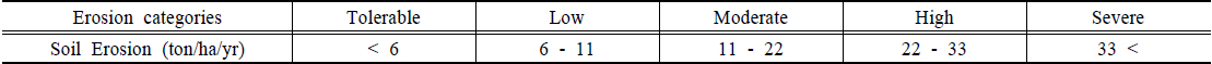 필요가 있다는 기준을 제시하고 있다(MOE, 2012a; MOE, 2012b). 그러나 전국 표토침식량 예비조사(MOE, 2012a; MOE, 2012b)에 따르면 연평균 표토침식량이 33 ton/ha/yr이상인 면적은 국토의 30% 이상이며, 연평균 표토침식량이 50 ton/ha/yr 이상인 면적은
