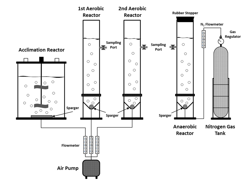 mg MLSS/L). The prepared mixed liquor was incubated in the 1st aerobic cylindrical reactor (diameter of 4 cm) with the constant aeration of 2 mL/min