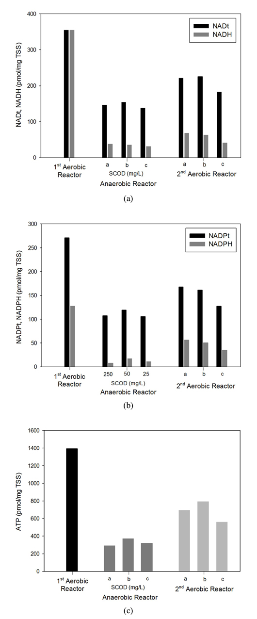 time, COD level, and temperature of the anaerobic stage intervening the 1st and 2nd aerobic stages were varied, the concentrations of energy substances of the 2nd aerobic stage were measured and compared to those of the 1st aerobic stage. No study had been presented lately on the understanding of the intracellular