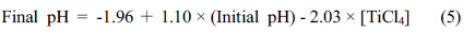 최종 pH는 접심합성설계법에 따라 실험을 수행한 결과 실험범위 내([TiCl4] = 0.35-0.55 mM, 초기 pH = 5.5-8.5)에서 2.8-6.5로 나타났다(Table 1). 최종 pH를 종속변수로 반응표면분석 결과 1차식을 만족하였다(식 (5)). 회귀모델의 결정 계수는 0.866으로 나타났다. 1차항의 p-value는 0.01 이하로 유의성이 인정되었다. 모델의 적합성결여(lack of fit)는 0.321(p-value>0.05)로 만족하여 유의하였다(Table 2). 초기 pH항에 대한 p-value는 0.05이하로 만족하였지만 [TiCl4] 항은 0.481(p-value<0.05)로 유의성에 만족하지 않았다. 따라서 [TiCl4]항은 모델과의 상관관계가 낮다는 것을 알 수 있다.