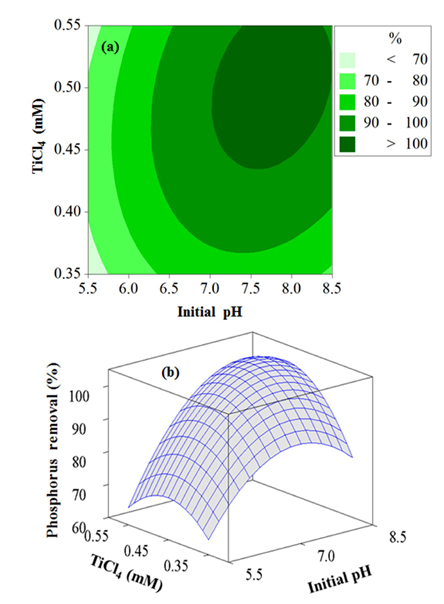 Two-dimensional contour plots (a) and three-dimensional contour plots (b) of the quadratic model for phosphorus removal (Eq. (4)) with respect to TiCl4 concentration and initial pH within the design boundaries.