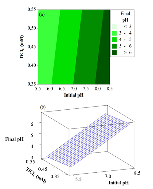 Two-dimensional contour plots (a) and three-dimensional contour plots (b) of the first-order model for final pH (Eq. (5)) with respect to TiCl4 concentration and initial pH within the design boundaries.