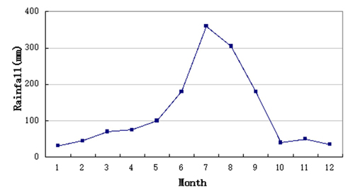 9월까지의 강수량이 매월 170 mm 이상의 집중적인 강우로 전체 강수량의 72.7%를 차지하고 있어 하절기에 많고 동절기에 적은 전형적인 우리나라의