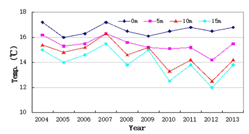 Fig. 5는 수심에 따른 수온변화를 보여주고 있다. 수온은 수심이 깊을수록 낮아지는 경향을 보였으며 표수층보다는 수심이 깊을수록 연도별 온도변화가 큰 것으로