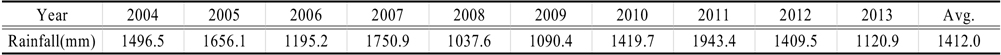 조사기간 중 대전지역의 강수량을 관측한 결과, 연평균 1,412.0 mm의 강수량을 나타내었으며 연도, 계절별로 강수량의 변동이 심하였다. 연도별로