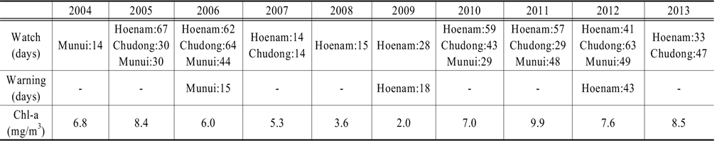 Table 2는 조류경보 발령 연도별 현황을 나타내고 있는데 추동취수탑의 경우 10년 동안 7회 정도가 조류주의보가 발령되었으며 평균 40일 이상 지속되었다.