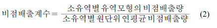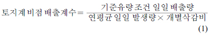 배출계수를 적용하도록 되어 있는데 이를 이용하여 토지계 개별 배출수의 배출계수 산정 식을 변형하면 식 (1)과 같이 정리할 수 있다.