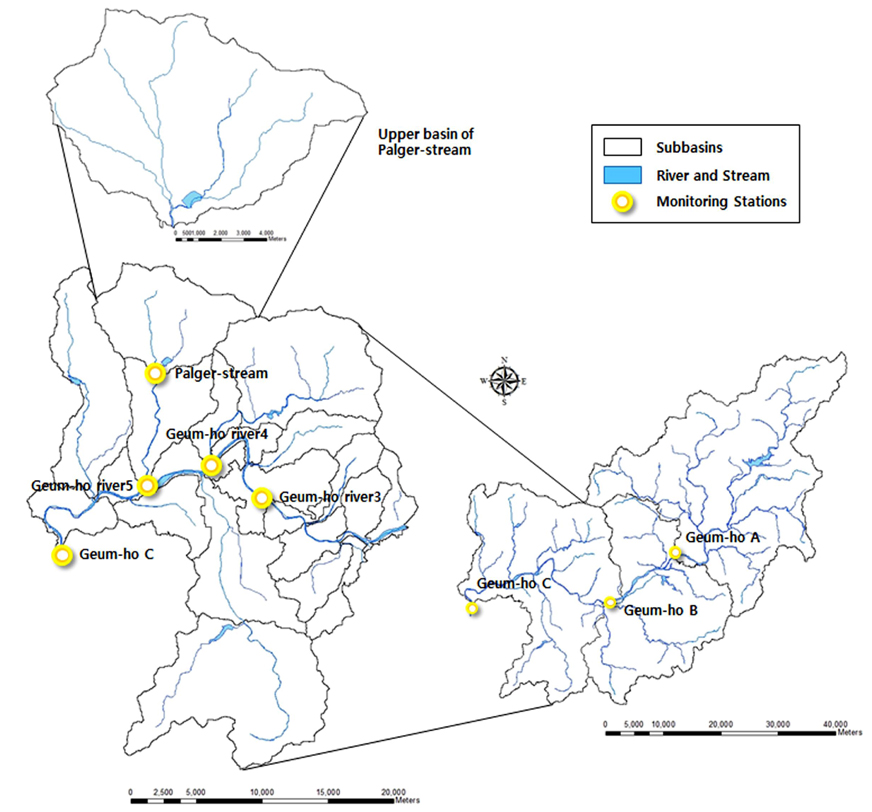 이루어졌으며, 관심지역인 금호C는 환경부 하천수질측정망의 금호강 3~5, 팔거천 지점에서 추가적으로 보정 및 검증을 수행하였다(Fig. 1). 다만, 금호B 지점은 2000년대 후반 위치변경이 있었다는 점을 참고하여 2013년을 보정기간으로, 2012년은 검증기간으로 설정하였고, 그