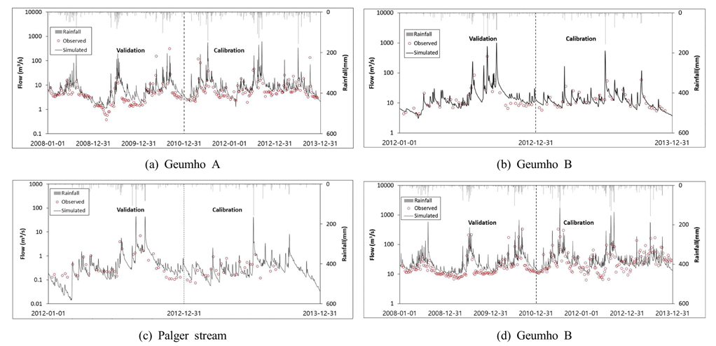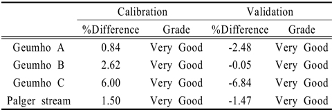 대상지역의 유출량 보정(%Differ.; ±0.84~6.00) 및 검증(%Differ.; -0.05~-6.84) 결과, 전 지점에서 Very good으로 평가되었으며, 이로부터 모의치가 실측치를 비교적 잘 반영하고 있는 것으로 판단된다(Table 3). %Difference가 음의 값으로 산정될 경우, 모의치가 실측치에 비하여 상대적으로 높게 나타난 것이며, 양의 값으로 산정될 경우는 모의치가