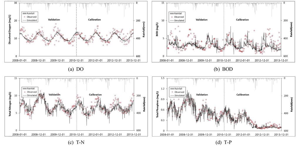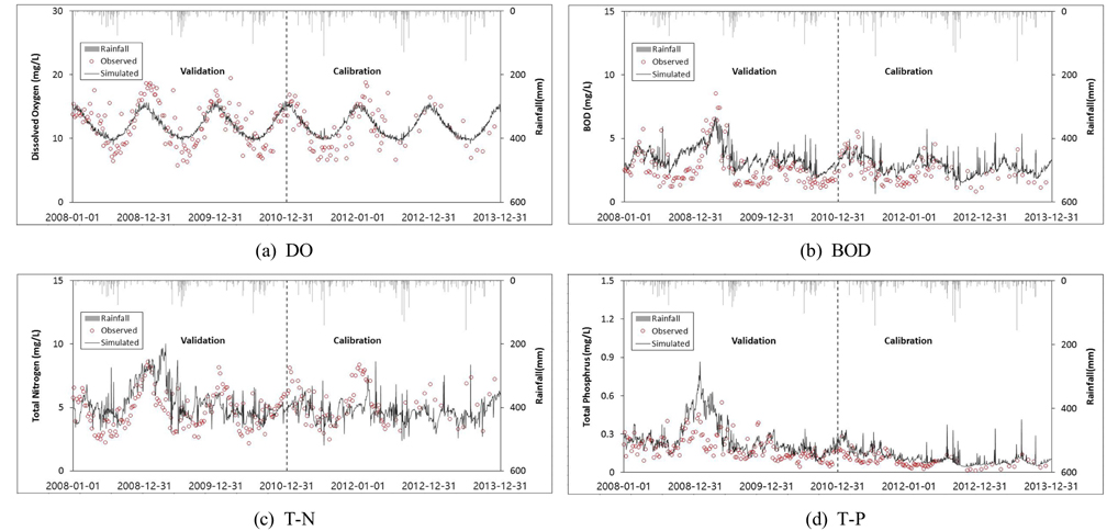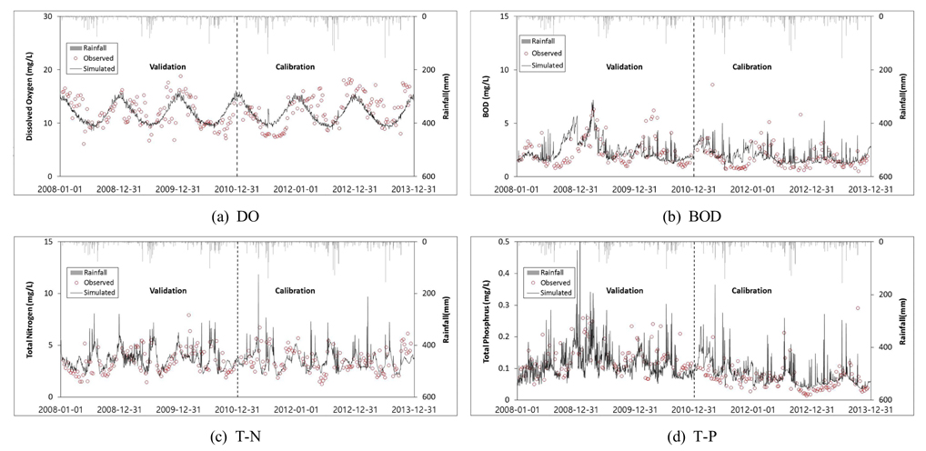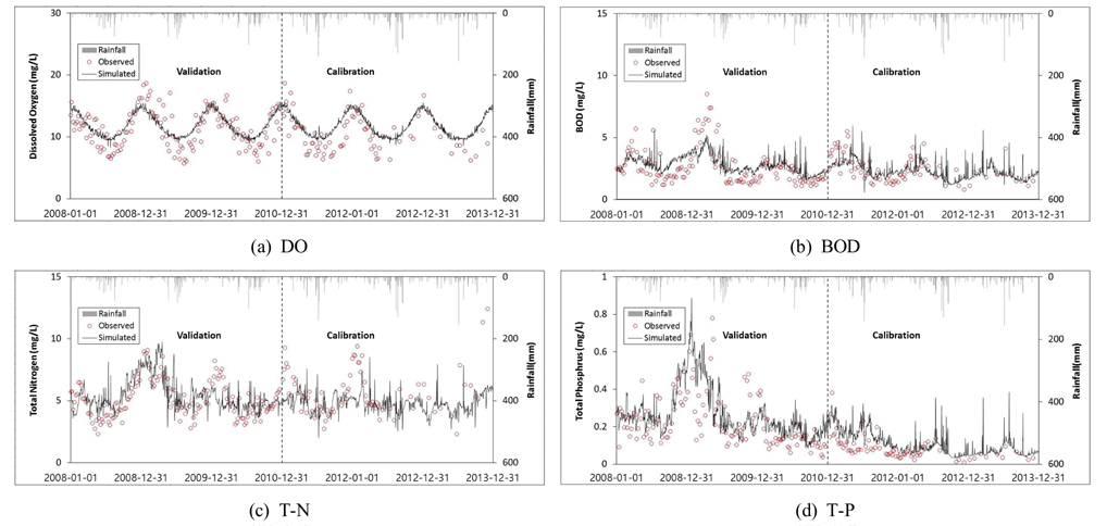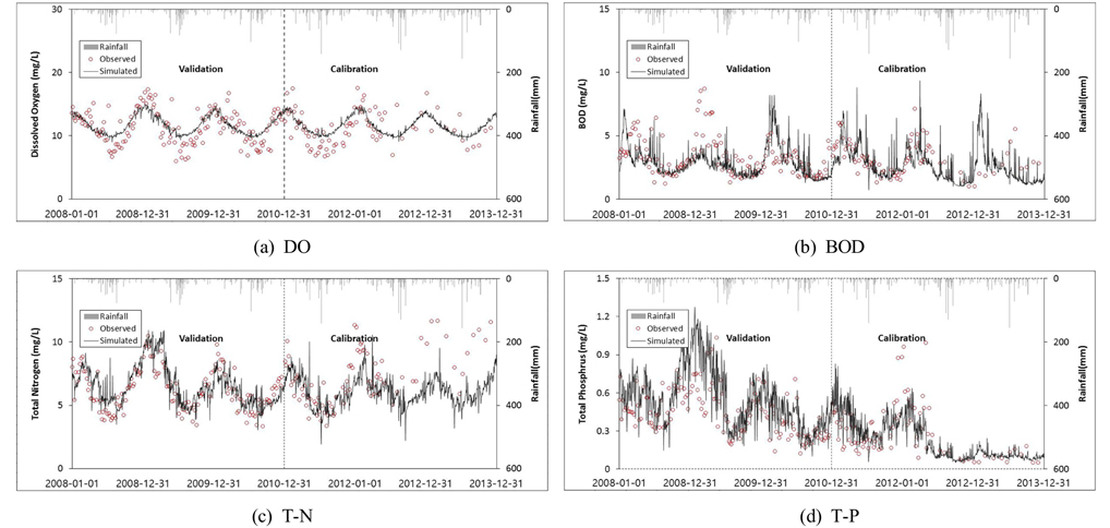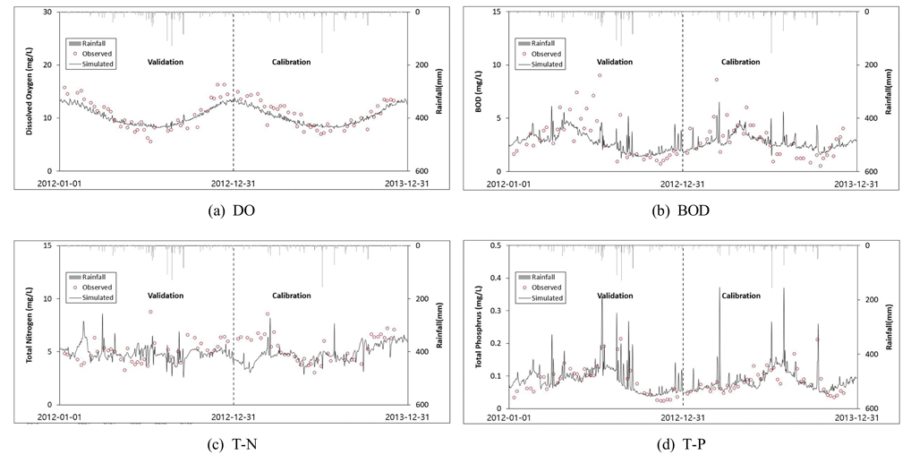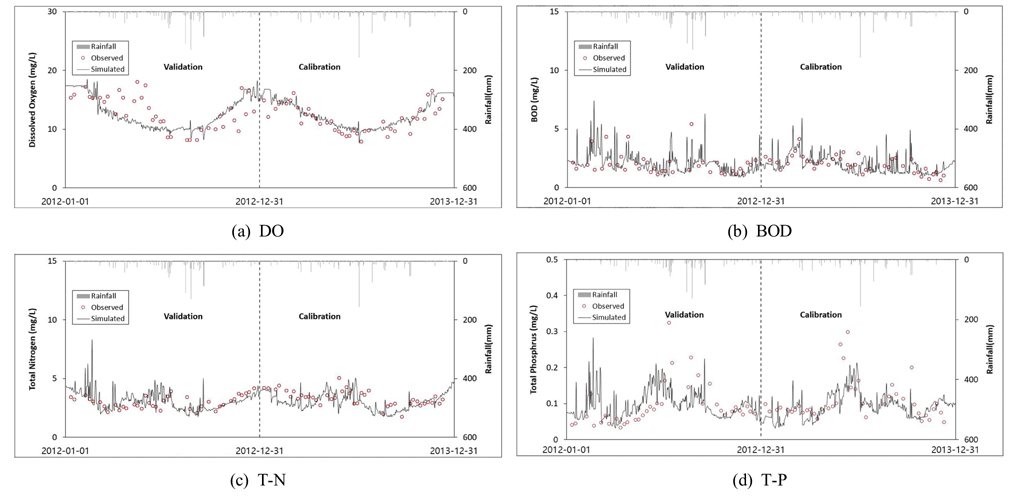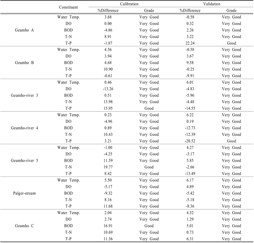 대상유역의 수질 보정 및 검증 결과, 수온과 DO의 경우 보정과 검증 모두 Very good으로 평가되었으며, BOD는 금호C의 보정에서 Good으로