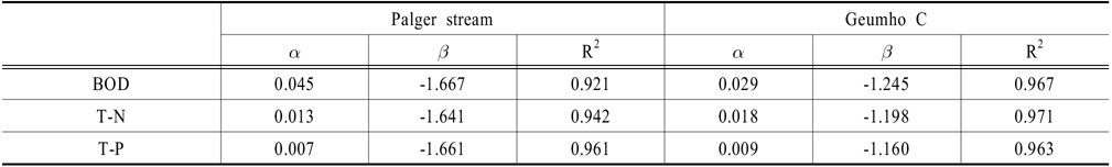 배출량을 이용하여 유량조건에 따른 비점배출계수 추정을 위한 관계식의 상수(α)와 지수(β)를 도출하였으며, 그 과정은 다음과 같다.