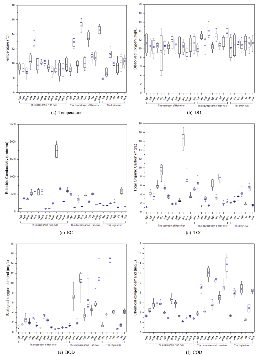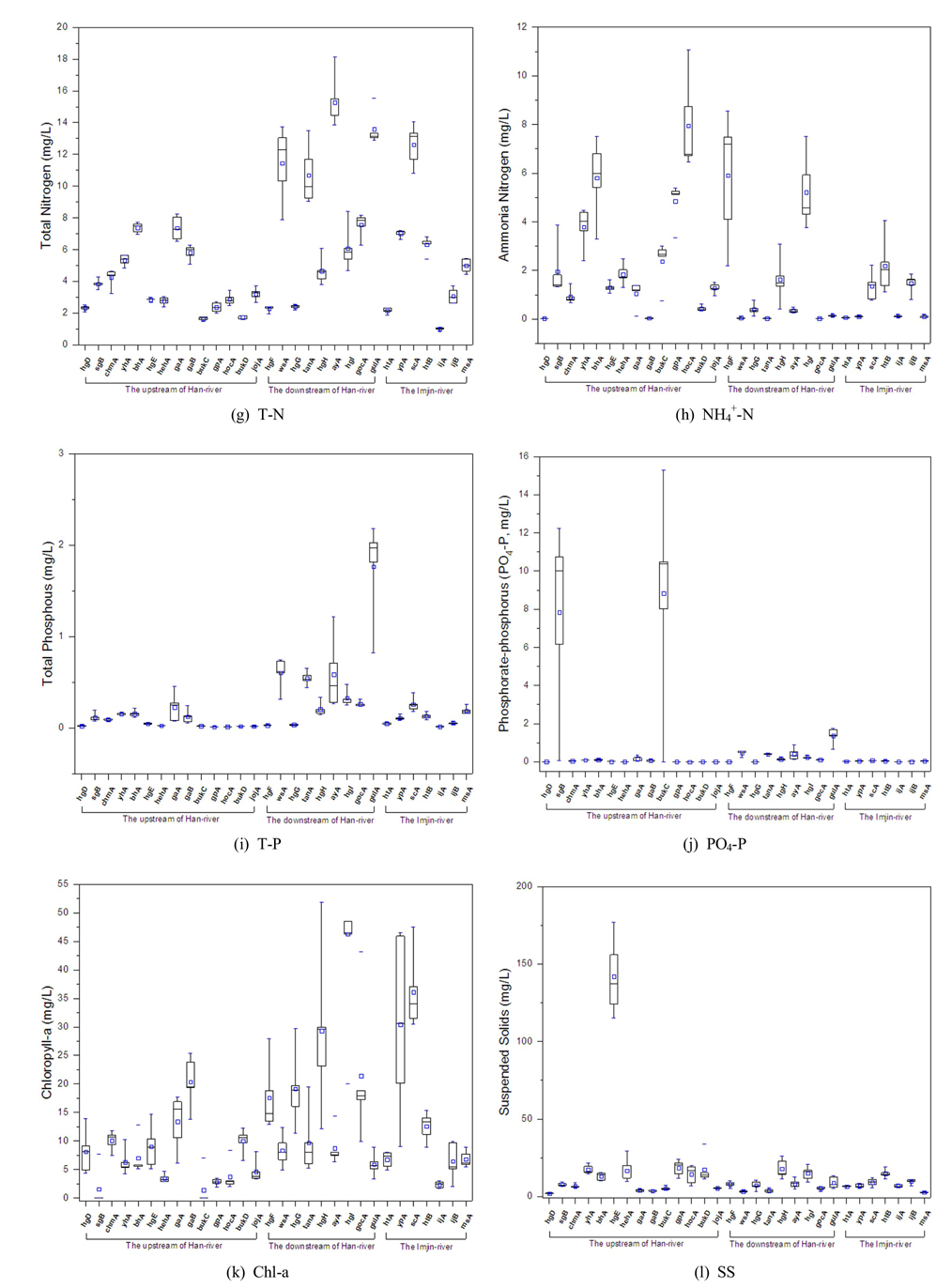 수질오염도를 분석하여 box형 그래프로 나타낸 결과이다. 유기오염 및 영양염류 수질항목의 경우, 한강하류 지류 중에 대규모 환경기초시설의 방류구가