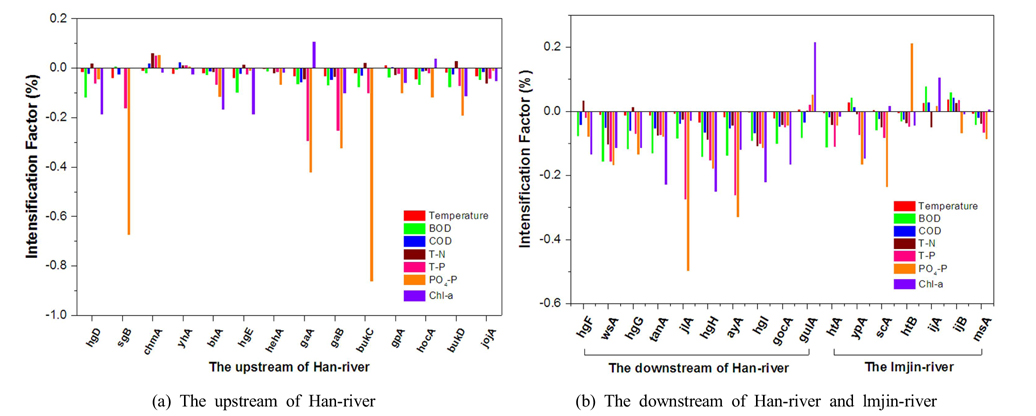 Fig. 3은 같은 기간 동안 수온, BOD5, CODmn, T-N, T-P, PO4-P, Chl-a 연차별 증가율을 분석한 결과로서 대부분 지역의 수질이 개선되고 있으나 임진강 유역의 영평A, 임진A, 임진B 단위유역의 BOD5, CODmn가 증가하는 추세를 보였으며 굴포A 단위유역은 T-P, PO4-P, Chl-a, 수온이 매년 증가하고 있는 것으로 나타났다.