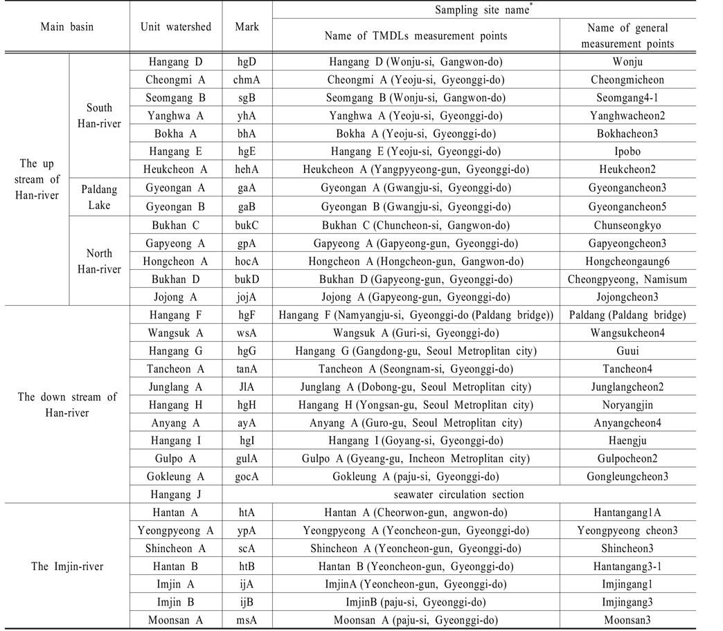 하천 내 수질특성분석을 위한 대상유역은 해수유통구간인 한강J 단위유역을 제외한 31개 단위유역 말단 수질측정지점의 5년간 수질 측정자료를 분석하였으며,